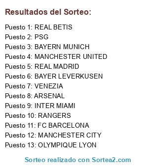 Lista de participantes: ARSENAL, MANCHESTER CITY, MANCHESTER UNITED, FC BARCELONA, RANGERS, INTER MIAMI, REAL MADRID, BAYERN MUNICH, REAL BETIS, PSG, VENEZIA, OLYMPIQUE LYON, BAYER LEVERKUSEN.