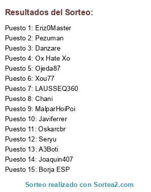Lista de participantes: Javiferrer, Ox Hate Xo, MalparHoiPoi, Borja ESP, Oskarcbr, LAUSSEQ360, Seryu, Pezuman, A3Boti, Danzare, Xou77, Ojeda87, Eriz0Master, Joaquin407, Chani.