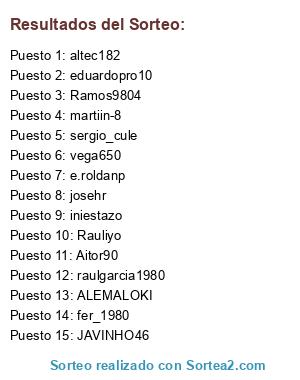 Lista de participantes: Rauliyo, ALEMALOKI, raulgarcia1980, vega650, fer_1980, e.roldanp, Ramos9804, JAVINHO46, sergio_cule, iniestazo, eduardopro10, josehr, altec182, Aitor90, martiin-8.