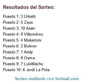 Lista de participantes: 1 Andy, 2 Bukron, 3 Urketti, 4 Makaroov, 5 Zeus, 6 Jordi La Puta, 7 LuisMacho, 8 Osma, 9 Villanoinsu, 10 Asier.