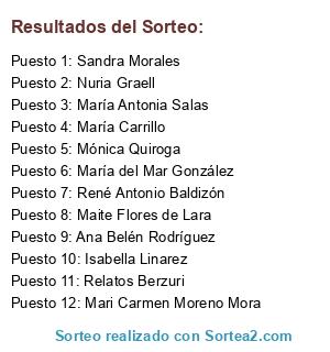 Lista de participantes: María Carrillo, Relatos Berzuri, María del Mar González, René Antonio Baldizón, Sandra Morales, Maite Flores de Lara, María Antonia Salas, Nuria Graell, Ana Belén Rodríguez, Mónica Quiroga, Mari Carmen Moreno Mora, Isabella Linarez.