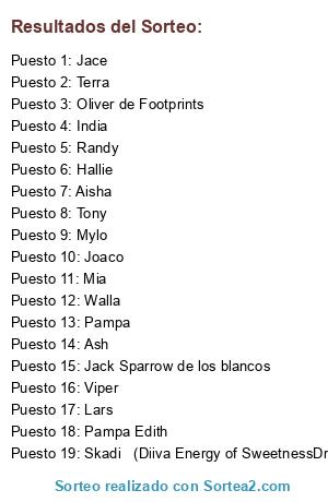 Lista de participantes: Skadi (Diiva Energy of SweetnessDreams), Pampa Edith, Ash, Randy, Lars, Jace, Hallie, Joaco, India, Terra, Aisha, Walla, Mia, Mylo, Tony, Jack Sparrow de los blancos, Oliver de Footprints, Pampa, Viper.