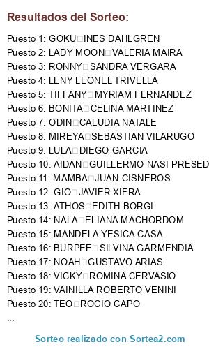 Lista de participantes: NALA ELIANA MACHORDOM, MAMBA JUAN CISNEROS, VICKY ROMINA CERVASIO, CHRIS MARIA TELLO, NOAH GUSTAVO ARIAS, BURPEE SILVINA GARMENDIA, GOKU INES DAHLGREN, ODIN CALUDIA NATALE, BONITA CELINA MARTINEZ, TEO ROCIO CAPO, LULA DIEGO GARCIA, GIO JAVIER XIFRA, TIFFANY MYRIAM FERNANDEZ, LADY MOON VALERIA MAIRA, MIREYA SEBASTIAN VILARUGO, JACE DAIANA ZORGNO, ATHOS EDITH BORGI, AIDAN GUILLERMO NASI PRESEDO, RONNY SANDRA VERGARA, VAINILLA ROBERTO VENINI, MANDELA YESICA CASA, LENY LEONEL TRIVELLA.