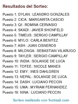 Lista de participantes: ASH JUAN CISNEROS, QI ROMINA CERVASIO, NINA LUCIANO PECCIN, NEPAL SOLANGE DE LUCA, INDIA SOLANGE DE LUCA, EMY INES DAHLGREN, DASH LUCIANO PECCIN, SKADI JAVIER SHONFELD, TIMEUS SERGIO CAMPILLAY, TAYLER SERGIO CAMPILLAY, MYLO CARLA BENITEZ, UMA MYRIAM FERNANDEZ, MILONGA SEBASTIAN VILARUGO, DYLAN LEANDRO GONZALES, CICA MARGARITA CASCIO, TOFEE NICOLE MANES.