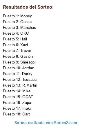 Lista de participantes: Cart, Darky, Gastón, GOAT, Gonza, Hail, Iñaki, Jordan, Manchas, Mikel, Money, OKC, R.Martin, Smeagol, Trevor, Tsusaba, Xavi, Zapa.