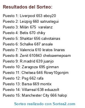 Lista de participantes: Schalke 687 ansale, Milán 675 varelanz, Shaktar 656 calvotainas, Barsa 669 montix, Betis 670 chiky, Zenit 610843 cheloaemepoam, Villarreal 638 eduazolt, Psg 662 rafa, Manchester City 666 halop, Valencia 610 kratos linares, Liverpool 653 eboy20, Chelsea 646 Rowy10gonjim, Leizpig 660 satrustegui, Zaragoza 695 ginman, R.madrid 639 juanjo.