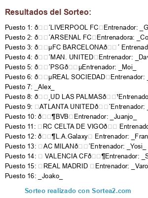 Lista de participantes: 🔶L.A.Galaxy⚪ Entrenador: _Fran_, ⚪REAL MADRID ⚪Entrenador: _Varo_, 🔸UD LAS PALMAS🔹Entrenador: _Jon_, ⚫AC MILAN🔴Entrenador: _Yosi_, ⚪RC CELTA DE VIGO💠Entrenador: _Manolow_, 🔴ARSENAL FC⚪Entrenadora: _Coe_, 🔴PSG🔵Entrenador: _Moi_, 🔴MAN. UNITED⚪Entrenador: _David_, 🔶BVB⚫Entrenador: _Juanjo_, ⚪ VALENCIA CF🔶Entrenador: _Sergi_, 🔴LIVERPOOL FC⚪Entrenador: _Guille_, ⚫ATLANTA UNITED🔴Entrenador: _Rafa_, 🔵REAL SOCIEDAD⚪Entrenador: _Calo_, 🔵FC BARCELONA🔴 Entrenador: _Meri_, _Joako_, _Alex_.