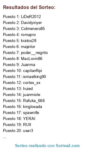 Lista de participantes: Davidyinyer, romapro, juanmiole, spawntfe, cortex_xx, MacLovin86, capitanflipi, Rafuka_666, poder__negrito, kratos28, kinglosada, majeitor, Colmenero85, ismaelking90, naxo1994martinez, LiDeR2012, isaakcinho, huied, Juanma, RUII, YERAI, user3.
