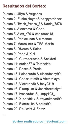 Lista de participantes: Pepe & Xipi, Ale & Clavijo, Pesca & Preda, Jiliyo & Vegapes, Riveros & Salas, Raulcdsf & Feroz, Alenzema & Cheru, Eboy & Soto, Piumpium & Josethecatalyst, Pablocusan & elmanue, Vicenton80 & faby9319, Marcoliner & TFS-Martin, Alex_c70 & carlitooos18, Lolodeurda & elnandosoy99, Twich_fresco_f & ivanin_7878, Aurich87 & Tetebelda, Dj_chetxu_83 & O_good_O, Chriszurita99 & Victorolayo, Ivancaduti & jumpy103_, Euskalplayer & happyordonez, X-peridtk-x & troyanitooo999, Florenkiko & potas99, David4cib & rafamarillo64, Curroporsche & Snaideri.