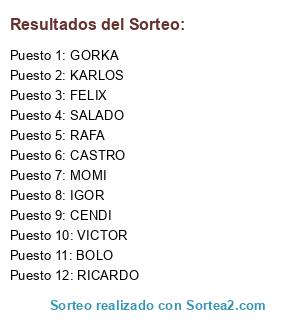 Lista de participantes: KARLOS, CASTRO, SALADO, CENDI, BOLO, FELIX, RAFA, IGOR, VICTOR, GORKA, MOMI, RICARDO.