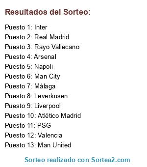 Lista de participantes: PSG, Atlético Madrid, Inter, Arsenal, Liverpool, Rayo Vallecano, Valencia, Man United, Napoli, Leverkusen, Real Madrid, Man City, Málaga.