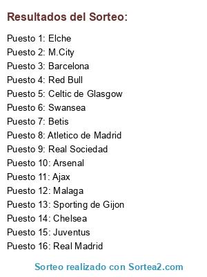 Lista de participantes: M.City, Malaga, Barcelona, Swansea, Elche, Real Madrid, Chelsea, Arsenal, Atletico de Madrid, Red Bull, Real Sociedad, Ajax, Betis, Juventus, Celtic de Glasgow, Sporting de Gijon.