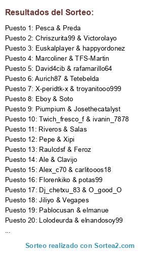 Lista de participantes: Pepe & Xipi, Ale & Clavijo, Pesca & Preda, Jiliyo & Vegapes, Riveros & Salas, Raulcdsf & Feroz, Alenzema & Cheru, Eboy & Soto, Piumpium & Josethecatalyst, Pablocusan & elmanue, Vicenton80 & faby9319, Marcoliner & TFS-Martin, Alex_c70 & carlitooos18, Lolodeurda & elnandosoy99, Twich_fresco_f & ivanin_7878, Aurich87 & Tetebelda, Dj_chetxu_83 & O_good_O, Chriszurita99 & Victorolayo, Ivancaduti & jumpy103_, Euskalplayer & happyordonez, X-peridtk-x & troyanitooo999, Florenkiko & potas99, David4cib & rafamarillo64, Curroporsche & Snaideri.