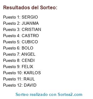 Lista de participantes: CENDI, BOLO, RAUL, KARLOS, FELIX, CASTRO, JUANMA, ANGEL, CRISTIAN, CUBICO, DAVID, SERGIO.