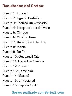 Lista de participantes: Independiente del Valle, Emelec, Universidad Católica, Aucas, Liga de Quito, Delfín, Técnico Universitario, Barcelona, Guayaquil City, Deportivo Cuenca, Mushuc Runa, Manta, Macará, Olmedo, El Nacional, Liga de Portoviejo.