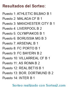 Lista de participantes: AS ROMA B 2, INTER B 1, MALAGA CF B 1, BORUSSIA MG B 3, FC PORTO B 1, ATHLETIC BILBAO B 1, MANCHESTER CITY B 1, VILLARREAL CF B 1, OLYMPIAKOS B 1, FC BAYERN B 2, BOR. DORTMUND B 2, REAL BETIS B 1, LIVERPOOL B 2, ARSENAL B 1.