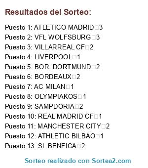 Lista de participantes: AC MILAN 1, ATHLETIC BILBAO 1, ATLETICO MADRID 3, BOR. DORTMUND 2, BORDEAUX 2, LIVERPOOL 1, MANCHESTER CITY 2, OLYMPIAKOS 1, REAL MADRID CF 1, SAMPDORIA 2, SL BENFICA 2, VFL WOLFSBURG 3, VILLARREAL CF 2.