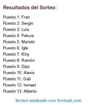 Lista de participantes: Alberto, Luis, Diaz, Fran, Ismael, Ramón, Kiny, Sergio, Peluca, Alexis, Igle, Manolo, Gali.