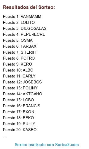 Lista de participantes: BUBO, BARICELLI, FARBAX, CARLY, LOBO, PEPERECRE, DAVIDFENIX, ALBO, BEKO, FRANCIS, LOLITO, JUANMI_CORDOBA, HONDA, BELLOTO, EXON, POTRO, CORTEX, MASKY, KASEO, SHERIFF, KERO, AKTGANO, SOCCATALA, DIEGOSALAS, POLINY, SULLY, VITI, FER_DON3P, EDDY, JOSEBGS, OSMA, VANMAMM.