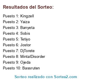 Lista de participantes: Ojeda, Banyeta, Sobis, Jostor, MintalDisorder, Tetiyo, Kingzell, Bassruten, Yaiza, DjTorete.