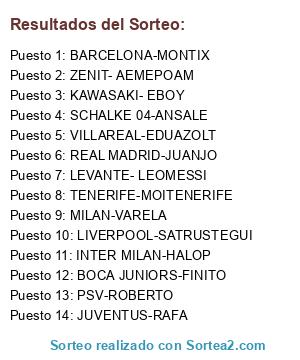 Lista de participantes: ZENIT- AEMEPOAM, LIVERPOOL-SATRUSTEGUI, KAWASAKI- EBOY, LEVANTE- LEOMESSI, MILAN-VARELA, REAL MADRID-JUANJO, TENERIFE-MOITENERIFE, JUVENTUS-RAFA, VILLAREAL-EDUAZOLT, BARCELONA-MONTIX, PSV-ROBERTO, INTER MILAN-HALOP, BOCA JUNIORS-FINITO, SCHALKE 04-ANSALE.