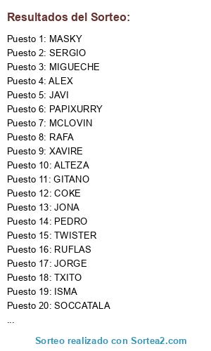 Lista de participantes: SERGIO, CARLY, MAGETO, MCLOVIN, FRAN, RAFA, COKE, JORGE, PIPO, MASKY, BOGA, JAVI, JONA, RICKY, MIGUECS, CADISTA, TWISTER, ALTEZA, PEDRO, TXITO, XAVIRE, PUNCHE, PAPIXURRY, GITANO, MIGUECHE, GALLEGO, SOCCATALA, ISMA, ALEX, RUFLAS, BILLY, NCOLAY.