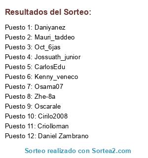 Lista de participantes: CarlosEdu, Cirilo2008, Criolloman, Daniyanez, Daniel_Zambrano, Jossuath_junior, Kenny_veneco, Mauri_taddeo, Oct_6jas, Osama07, Oscarale, Zhe-8a.