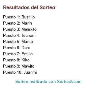 Lista de participantes: Marín, Juanmi, Emilio, Mawito, Kiko, Marco, Dani, Tsunami, Bustillo, Melekito.