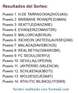 Lista de participantes: JAYPERRO (VALENCIA), INCHEON UNITED(LAUSSEQ360), SCHLKE04(A3BOTI), FC SEOUL(SERYU), N.DE TARRAGONA(ZHOLVAX), SEATTLE(DANZARE), ATHLITIC BILBAO(LITOS89), REAL BETIS(OSKARCBR), EVIAN(ERIZOMASTER), WOLVES(OJEDA87), BRISBANE ROAR(PEZUMAN), SEVILLA(LOPEINA), MALLORCA(BORJA), MALAGA(DAVIDBCN25).