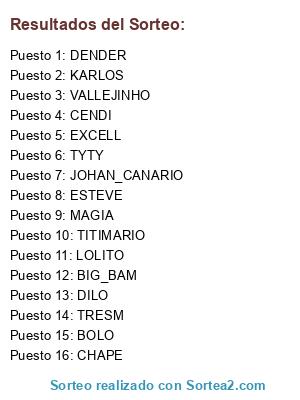 Lista de participantes: DENDER, TYTY, DILO, KARLOS, CENDI, MAGIA, BIG_BAM, BOLO, JOHAN_CANARIO, EXCELL, VALLEJINHO, LOLITO, CHAPE, ESTEVE, TRESM, TITIMARIO.