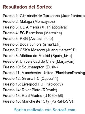 Lista de participantes: Gimnàstic de Tarragona (Juanfrantorralba), Southampton (Eusk-), Boca Juniors (isma123i), PSG (Assasinstoto), Atlético de Madrid (Spain_kiko), CSKA Moscow (Juangutierrez91), Manchester United (FlacidoenDomingo), Real Madrid (U1060358), Málaga (Moncayitos), River Plate (R9ronie), UD Almería (X_ThiagoSilva), Girona FC (Capea41), FC Barcelona (Marcalca), Liverpool FC (Pabloggv), Manchester City (PaRaNoSiS), Universidad de Chile (Marjaivan).