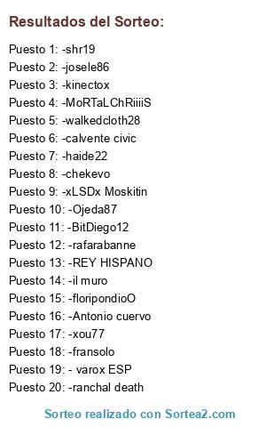 Lista de participantes: - shr19, - rafarabnne, - josele86, - guardi17, - masacrecar, - Chungal, - BORJA ESP, - javiferrer, - seryu, - BATIGUAJE, - MierdiSoldier, - Chekevo, - Kasper 18 21, - killtopinocchio, - b1yto, - Pablosky086.