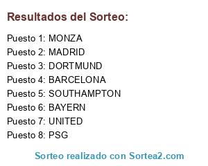 Lista de participantes: BAYERN, MADRID, PSG, SOUTHAMPTON, MONZA, BARCELONA, UNITED, DORTMUND.