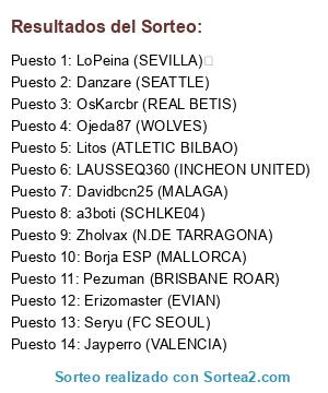 Lista de participantes: OsKarcbr (REAL BETIS), Danzare (SEATTLE), a3boti (SCHLKE04), Ojeda87 (WOLVES), Zholvax (N.DE TARRAGONA), Pezuman (BRISBANE ROAR), Jayperro (VALENCIA), LoPeina (SEVILLA), Davidbcn25 (MALAGA), Litos (ATLETIC BILBAO), Erizomaster (EVIAN), Borja ESP (MALLORCA), Seryu (FC SEOUL), LAUSSEQ360 (INCHEON UNITED).