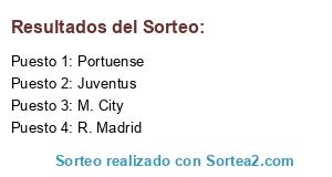 Lista de participantes: R. Madrid, Juventus, Portuense, M. City.