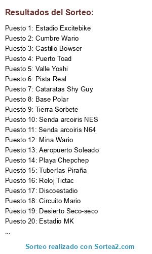 Lista de participantes: Estadio MK, Parque Acuático, Ruinas Roca Picuda, Puerto Toad, Mansión Retorcida, Cataratas Shy Guy, Aeropuerto Soleado, Discoestadio, Cumbre Wario, Ruta Celeste, Dunas Huesitos, Castillo Bowser, Circuito Yoshi, Estadio Excitebike, Ruta Dragón, Mute City, Pradera MuMu, Circuito Mario, Playa Chepchep, Desierto Seco-seco, Pista Real, Jungla DK, Estadio Wario, Tierra Sorbete, Valle Yoshi, Reloj Tictac, Tuberías Piraña, Senda arcoiris N64, Senda arcoiris NES, Base Polar, Circuito Hyrule, Mina Wario.