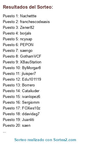 Lista de participantes: Arisan99, borjals, Borrero, ByMorgar8, Carlos9, Cataliuder, Dante, ddavidag7, Edu101119, FOXes10z, franchescodeasis, GothamVCF, ivanlopez6, jluisper7, jmestcan, Jomalk, Juanliti, miguelrrj, Molina11, Nachettte, ncysap, Ostritx, PEPON, pukirrijunior, saen, saengo, Sergiomm, Vitin86, XBauStation, Zener82.
