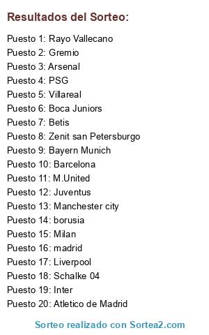 Lista de participantes: Zenit san Petersburgo, borusia, madrid, Liverpool, Barcelona, Juventus, M.United, Milan, PSG, Inter, Arsenal, Betis, Villareal, Boca Juniors, Atletico de Madrid, Manchester city, Schalke 04, Rayo Vallecano, Bayern Munich, Gremio.