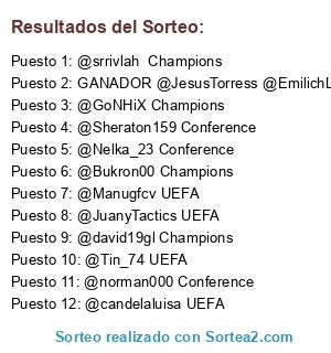Lista de participantes: @Tin_74 UEFA, @JuanyTactics UEFA, @Manugfcv UEFA, @candelaluisa UEFA, @Sheraton159 Conference, @Nelka_23 Conference, GANADOR @JesusTorress @EmilichLol Conference, @norman000 Conference, @GoNHiX Champions, @david19gl Champions, @Bukron00 Champions, @srrivlah Champions.