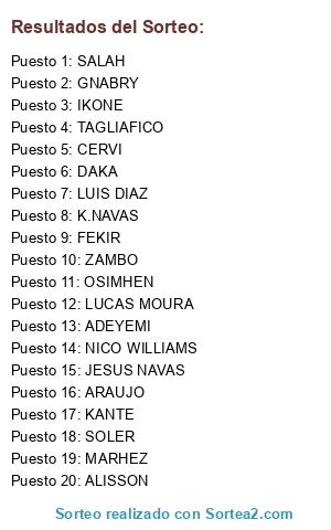 Lista de participantes: OSIMHEN, KANTE, DAKA, JESUS NAVAS, FEKIR, ZAMBO, K.NAVAS, ALISSON, ADEYEMI, ARAUJO, IKONE, SOLER, GNABRY, TAGLIAFICO, CERVI, NICO WILLIAMS, SALAH, LUCAS MOURA, LUIS DIAZ, MARHEZ.