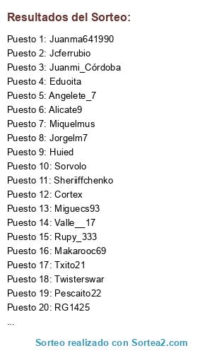 Lista de participantes: Alicate9, Amortee, Ancor, Angelete_7, Bogarde9, Cortex, Carly777, Cheche19, Eduoita, Farbax, GarryPes, Huied, Ismahitaro, Jorgelm7, Juanma641990, Juanmi_Córdoba, Jcferrubio, Luis22, Makarooc69, Miquelmus, Miguecs93, Pescaito22, Rupy_333, RG1425, Roqueluis, Sheriiffchenko, Sorvolo, Selinichev, Txito21, Twisterswar, Valle__17, Waitas.