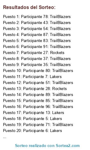 Lista de participantes: Participante 1: Lakers, Participante 2: Lakers, Participante 3: Lakers, Participante 4: Lakers, Participante 5: Lakers, Participante 6: Lakers, Participante 7: Lakers, Participante 8: Lakers, Participante 9: Lakers, Participante 10: Lakers, Participante 11: Lakers, Participante 12: Lakers, Participante 13: Lakers, Participante 14: Lakers, Participante 15: Lakers, Participante 16: Lakers, Participante 17: Lakers, Participante 18: Lakers, Participante 19: Rockets, Participante 20: Rockets, Participante 21: Rockets, Participante 22: Rockets, Participante 23: Rockets, Participante 24: Rockets, Participante 25: Rockets, Participante 26: Rockets, Participante 27: Rockets, Participante 28: Rockets, Participante 29: Rockets, Participante 30: Rockets, Participante 31: Rockets, Participante 32: Rockets, Participante 33: Rockets, Participante 34: TrailBlazers, Participante 35: TrailBlazers, Participante 36: TrailBlazers, Participante 37: TrailBlazers, Participante 38: TrailBlazers, Participante 39: TrailBlazers, Participante 40: TrailBlazers, Participante 41: TrailBlazers, Participante 42: TrailBlazers, Participante 43: TrailBlazers, Participante 44: TrailBlazers, Participante 45: TrailBlazers, Participante 46: TrailBlazers, Participante 47: TrailBlazers, Participante 48: TrailBlazers, Participante 49: TrailBlazers, Participante 50: TrailBlazers, Participante 51: TrailBlazers, Participante 52: TrailBlazers, Participante 53: TrailBlazers, Participante 54: TrailBlazers, Participante 55: TrailBlazers, Participante 56: TrailBlazers, Participante 57: TrailBlazers, Participante 58: TrailBlazers, Participante 59: TrailBlazers, Participante 60: TrailBlazers, Participante 61: TrailBlazers, Participante 62: TrailBlazers, Participante 63: TrailBlazers, Participante 64: TrailBlazers, Participante 65: TrailBlazers, Participante 66: TrailBlazers, Participante 67: TrailBlazers, Participante 68: TrailBlazers, Participante 69: TrailBlazers, Participante 70: TrailBlazers, Participante 71: TrailBlazers, Participante 72: TrailBlazers, Participante 73: TrailBlazers, Participante 74: TrailBlazers, Participante 75: TrailBlazers, Participante 76: TrailBlazers, Participante 77: TrailBlazers, Participante 78: TrailBlazers, Participante 79: TrailBlazers, Participante 80: TrailBlazers, Participante 81: TrailBlazers, Participante 82: TrailBlazers, Participante 83: TrailBlazers, Participante 84: TrailBlazers, Participante 85: TrailBlazers, Participante 86: TrailBlazers, Participante 87: TrailBlazers, Participante 88: TrailBlazers, Participante 89: TrailBlazers, Participante 90: TrailBlazers, Participante 91: TrailBlazers, Participante 92: TrailBlazers, Participante 93: TrailBlazers, Participante 94: TrailBlazers, Participante 95: TrailBlazers, Participante 96: TrailBlazers, Participante 97: TrailBlazers, Participante 98: TrailBlazers, Participante 99: TrailBlazers, Participante 100: TrailBlazers, Participante 101: TrailBlazers.