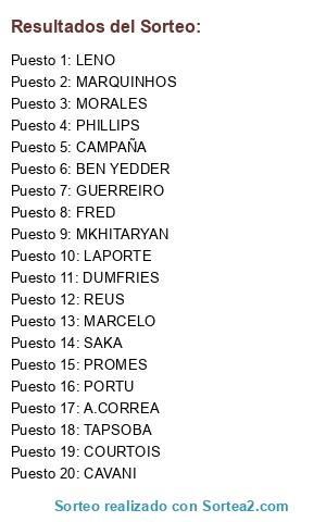 Lista de participantes: LENO, COURTOIS, DUMFRIES, TAPSOBA, MARQUINHOS, LAPORTE, MARCELO, GUERREIRO, SAKA, PORTU, REUS, CAMPAÑA, PHILLIPS, FRED, PROMES, MKHITARYAN, CAVANI, BEN YEDDER, MORALES, A.CORREA.