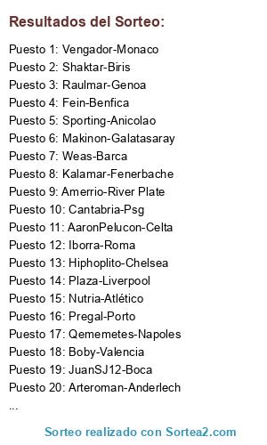 Lista de participantes: Arteroman-Anderlech, Jonan-Arsenal, Nutria-Atlético, Weas-Barca, Fein-Benfica, JuanSJ12-Boca, AaronPelucon-Celta, Hiphoplito-Chelsea, Kalamar-Fenerbache, Frako-Fulham, Makinon-Galatasaray, Raulmar-Genoa, HacheClement-Inter de Milan, Xikeras-Lazio, Plaza-Liverpool, Boby-Valencia, Coco-M.United, Danivalde-Milan, Vengador-Monaco, Qememetes-Napoles, Cantabria-Psg, Pregal-Porto, Escudero-R.B.Brasil, Eneko-Leipzig, Amerrio-River Plate, Iborra-Roma, Shaktar-Biris, Sporting-Anicolao.