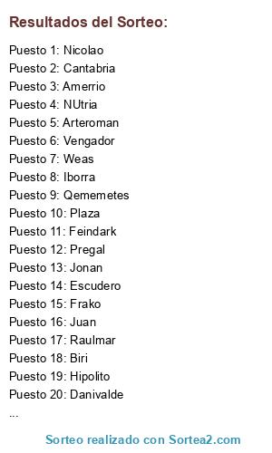 Lista de participantes: Danivalde, NUtria, Xikeras, Weas, Nicolao, Pregal, Hipolito, Parrita, Feindark, Plaza, Arteroman, Biri, Escudero, Eneko, Jonan, Amerrio, Qememetes, Juan, Cantabria, Iborra, Frako, Kalamar, Raulmar, Vengador.