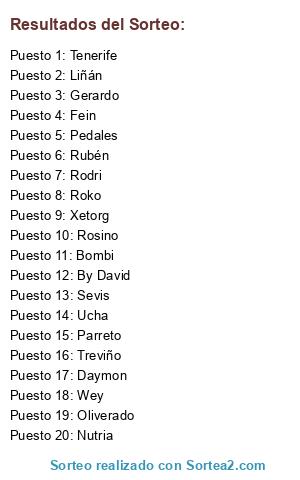 Lista de participantes: Pedales, Sevis, Nutria, Treviño, Ucha, Liñán, Tenerife, Daymon, Rodri, Fein, By David, Roko, Xetorg, Parreto, Wey, Rosino, Oliverado, Gerardo, Bombi, Rubén.