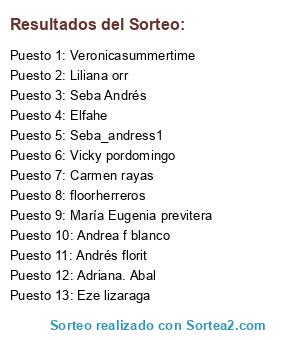 Lista de participantes: Veronicasummertime , Seba_andress1 , floorherreros , Adriana. Abal , Elfahe , Liliana orr , Eze lizaraga , , Seba Andrés , María Eugenia previtera , Vicky pordomingo , Andrea f blanco , Andrés florit , Carmen rayas , .