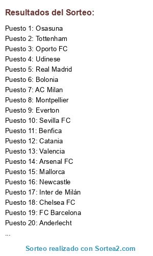 Lista de participantes: Oporto FC, Fenerbahçe Spor Kulübü, Real Madrid, Juventus, Inter de Milán, Manchester City FC, Chelsea FC, SS Lazio, Tottenham, AC Milan, Sevilla FC, Benfica, PSV, Schalke 04, Hoffenheim, FC Bayern Munchen, Osasuna, FC Barcelona, Newcastle, Mallorca, CSKA Moscow, Napoli, Catania, Borussia Dortmund, Bolonia, Everton, Montpellier, Anderlecht, Valencia, Arsenal FC, Udinese.