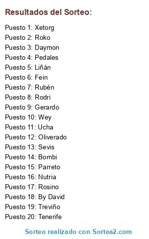 Lista de participantes: Gerardo, Nutria, Rubén, Treviño, Parreto, Ucha, Fein, Xetorg, Pedales, Daymon, Oliverado, Liñán, Rosino, Wey, Sevis, Rodri, By David, Tenerife, Roko, Bombi.