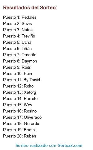 Lista de participantes: Wey, Parreto, Liñán, Xetorg, Roko, Sevis, Treviño, Pedales, Gerardo, Bombi, Rodri, Ucha, Daymon, Fein, Oliverado, Nutria, Tenerife, Rosino, Rubén, By David.
